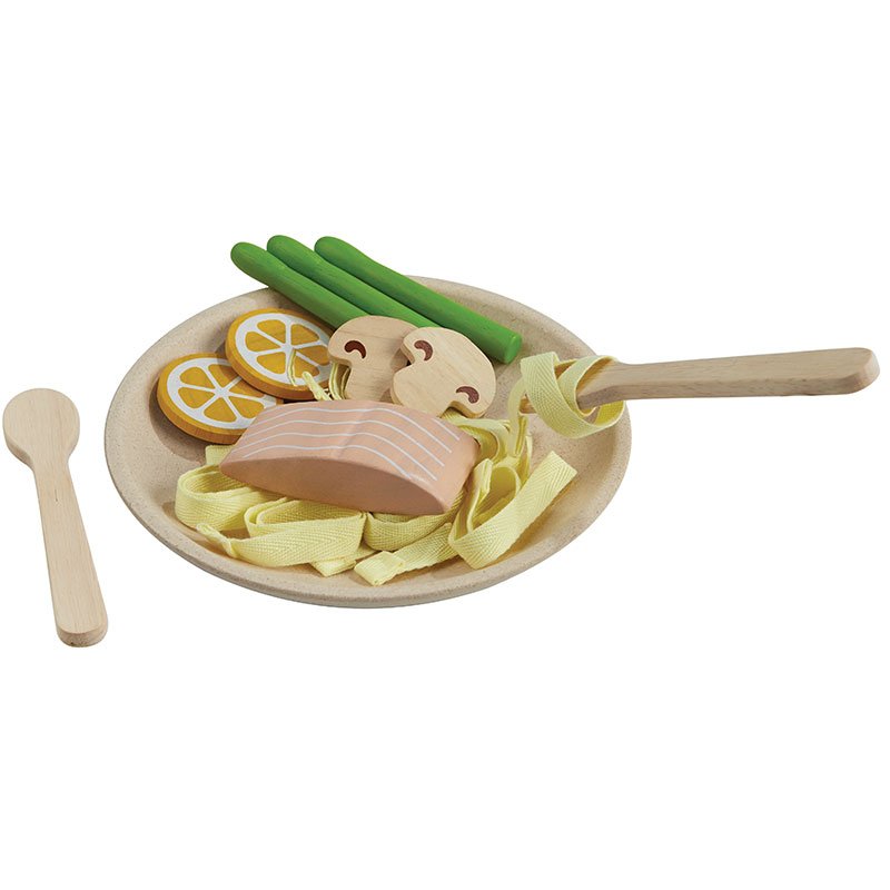 Μετατρέψτε τον χώρο παιχνιδιού του παιδιού σας σε μια φανταστική κουζίνα με αυτό το σετ ζυμαρικών. Περιλαμβάνει μακαρόνια, 1 φιλέτο σολομού, 3 σπαράγγια, 2 φέτες λεμόνι, 2 μανιτάρια, 1 πιρούνι, 1 κουτάλι και 1 πιατάκι.