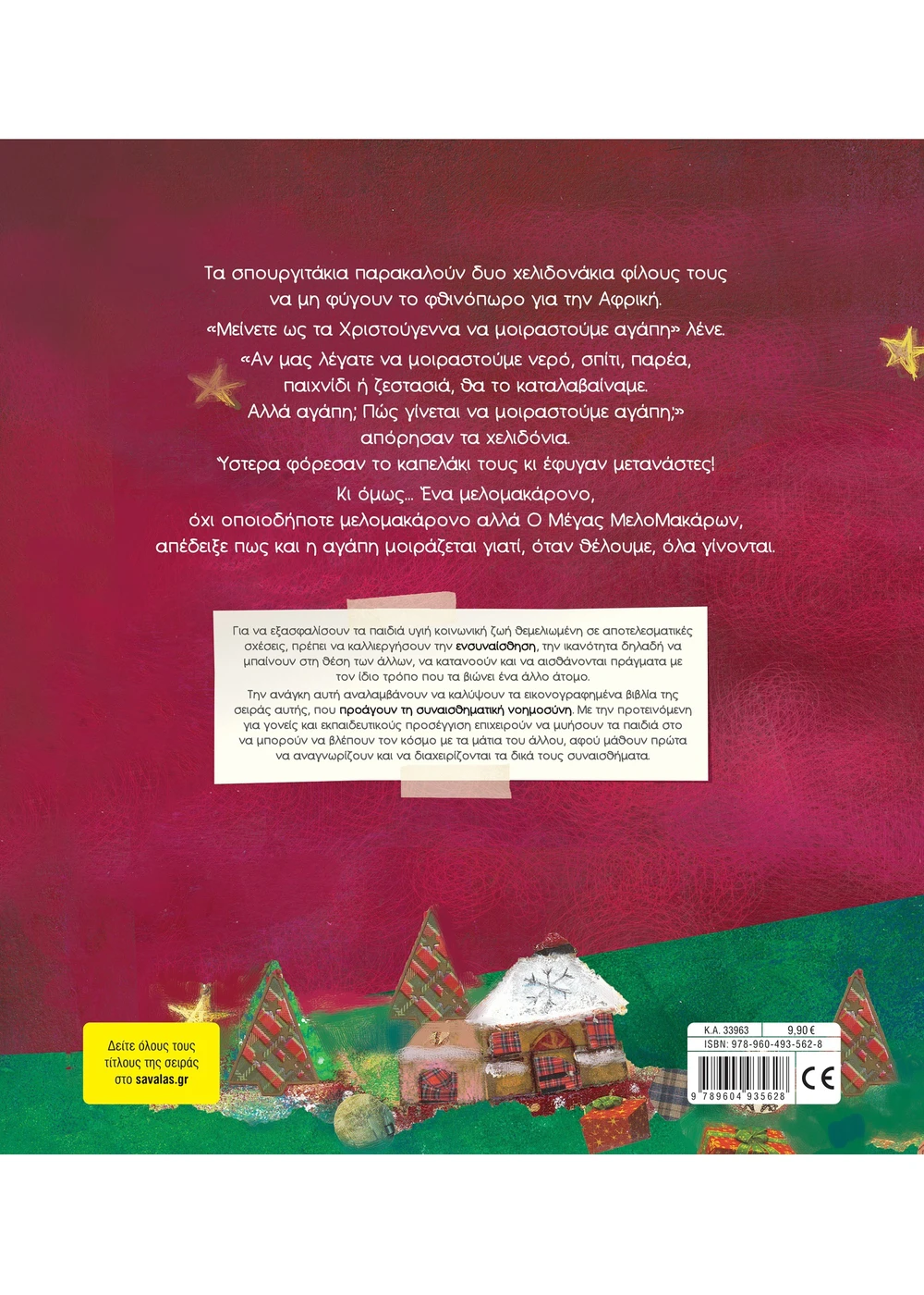 Το βιβλίο: Τα σπουργιτάκια παρακαλούν δυο χελιδονάκια φίλους τους να μη φύγουν το φθινόπωρο για την Αφρική. «Μείνετε ως τα Χριστούγεννα να μοιραστούμε αγάπη» λένε. «Αγάπη; Πώς γίνεται να μοιραστούμε αγάπη;» απόρησαν τα χελιδόνια. Κι όμως… ένα ξεχωριστό μελομακάρονο απέδειξε πως και η αγάπη μοιράζεται!