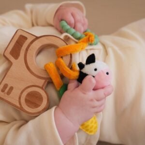 Τα τρία βαμβακερά κορδόνια έχουν στις άκρες τους κρεμαστά στοιχεία για να διεγείρουν τις αισθήσεις και να τραβήξουν την προσοχή του μωρού: ένα υφασμάτινο φύλλο, ένα μαλακό δαχτυλίδι και ένα απαλό βελούδινο παιχνίδι, τον Ζακ το Τουκάν.