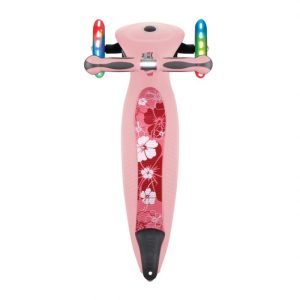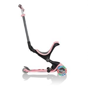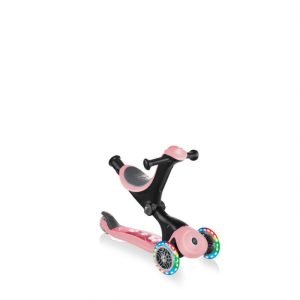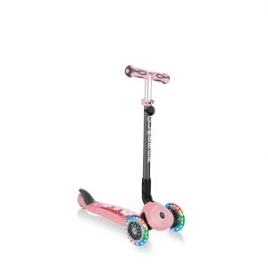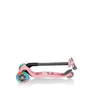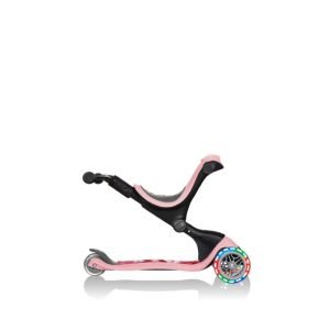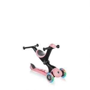 Globber Scooter Go-Up Deluxe Fantasy Lights Pastel Pink (647-211). Έξυπνη υποδοχή αποθήκευσης για το υποπόδιο. Μακριά άνετη σέλα που ρυθμίζεται σε 3 ύψη από μαλακό υλικό αφρώδες υλικό EVA. Η αλλαγή ύψους πραγματοποιείται εύκολα με την χρήση του ειδικού μοχλού.Σχεδιασμός που δεν απαιτεί καμία χρήση εργαλείου για την συναρμολόγηση ή την αλλαγή λειτουργία από καροτσάκι σε περπατούρα, πατίνι, ποδοκίνητο.Αφαιρούμενο υποπόδιο για άνεση και ασφάλεια.Πατενταρισμένο σύστημα ασφαλούς αναδίπλωσης με το πάτημα ενός κουμπιού που βρίσκεται στην πλαϊνή πλευρά. H επιφάνεια (deck) είναι κατασκευασμένη από υλικό που δεν γλιστράει και το πλαίσιο διαθέτει μεταλλικές ενισχύσεις. Εύκολη μετατροπή σε τρόλεϊ μεταφοράς.Μακρύ πίσω φρένο για βελτιωμένο φρενάρισμα και μεγαλύτερη διάρκεια στον χρόνο χρήσης.Το πατενταρισμένο κουμπί κλειδώματος του τιμονιού αποτρέπει την περιστροφή των δύο εμπρόσθιων τροχών δεξιά και αριστερά ώστε να κινούνται μόνο προς τα μπροστά και προς τα πίσω.Τροχοί από υλικό PU. 2 x 121 mm εμπρόσθιοι τροχοί και 1 x 80mm πίσω τροχός με ρουλεμάν ABEC5.Μπροστινοί τροχοί LED και τυπωμένο πλαίσιο.Χρώμα PASTEL PINK.