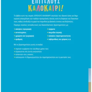 Το βιβλίο αυτό της σειράς «ΕΠΙΤΕΛΟΥΣ ΚΑΛΟΚΑΙΡΙ!» αποτελεί την ιδανική λύση για δημιουργική απασχόληση των παιδιών προσχολικής ηλικίας κατά τη διάρκεια των καλοκαιρι-νών διακοπών τους, καθώς συνδυάζει τη χαρά του παιχνιδιού με βασικές έννοιες και δεξιότητες. Περιέχει ποικίλες εκπαιδευτικές και διασκεδαστικές δραστηριότητες με: • ασκήσεις προγραφής • αντιστοιχίσεις • χρώματα και ζωγραφική • αριθμούς • σχήματα • παιχνίδια λογικής • ασκήσεις παρατηρητικότητας • λαβύρινθους και γρίφους κ.ά. Με τις δραστηριότητες αυτές τα παιδιά: • περνούν ευχάριστα τον ελεύθερο χρόνο τους • εξασκούνται στη λεπτή κινητικότητα • κατακτούν νέες γνώσεις • καλλιεργούν τη δημιουργικότητα, την παρατηρητικότητα και τη φαντασία τους. Στο τέλος του βιβλίου υπάρχουν οι απαντήσεις των δραστηριοτήτων, ώστε να μη μείνει στα παιδιά καμία απορία ή αμφιβολία.