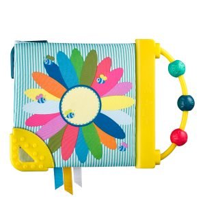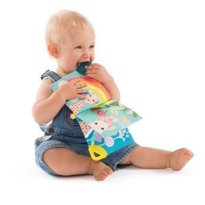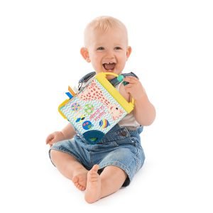 Θα ανακαλύψει πολλές δραστηριότητες: ένα χερούλι άβακα και 3 χάντρες για να μετακινεί, μια σφυριχτρούλα που είναι κρυμμένη στην πρώτη σελίδα, διάφορα υλικά για να εξερευνήσει, έντονα και με αντίθεση χρώματα, 2 μαλακά μέρη για να μασουλάει και να ανακουφίζει τα πονεμένα του ούλα.