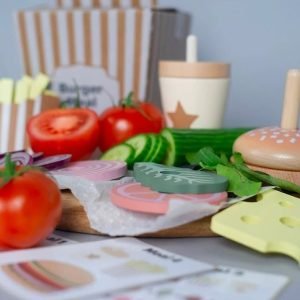 Απολαύστε αυτό το φανταστικό παιχνίδι με τους φίλους και την οικογένεια σας φτιάχνοντας τα αγαπημένα σας burger! Αφήστε τη φαντασία του μικρού σας να περιπλανηθεί ελεύθερα καθώς δημιουργεί γαστρονομικά αριστουργήματα με αυτό το στοιβαζόμενο σετ. Τα μικρά θα ενθουσιαστούν φτιάχνοντας μια ατελείωτα burgers καθώς ακολουθούν τις κάρτες του μενού
