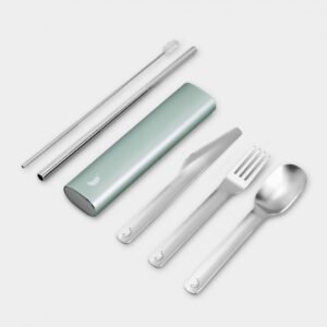 Σετ μαχαιροπήρουνων πλήρους μεγέθους 4 τεμαχίων. Περιλαμβάνει πιρούνι από ανοξείδωτο χάλυβα, κοφτερό μαχαίρι, κουτάλι, τηλεσκοπικό καλαμάκι και βουρτσάκι.