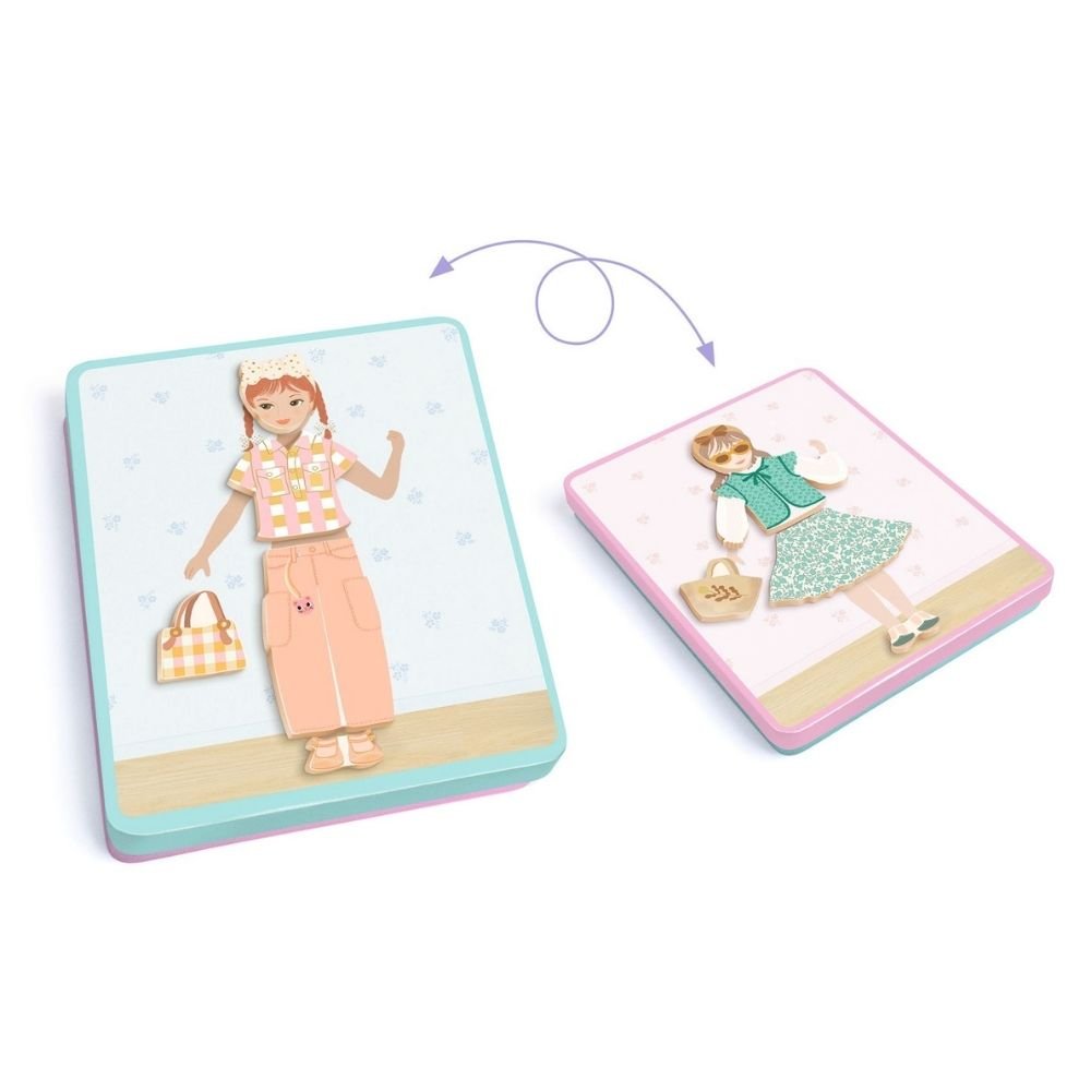 Ένα πρωτότυπο παιχνίδι ντυσίματος της εταιρείας Djeco με ξύλινους μαγνήτες σε μεταλλικό κουτί δύο όψεων. Τα παιδιά καλούνται να αναπαράγουν τις 12 εμφανίσεις των καρτών ή να δημιουργήσουν δικούς τους συνδυασμούς ρούχων και αξεσουάρ, επιλέγοντας την κατάλληλη πλευρά του κουτιού. Κάθε όψη έχει διαφορετική εικονογράφηση, προσφέροντας δύο σκηνικά παιχνιδιού για ατέλειωτη δημιουργικότητα. Οι ξύλινοι μαγνήτες αποθηκεύονται εύκολα μέσα στο κουτί, κάνοντάς το ιδανικό για παιχνίδι στο σπίτι, στη βόλτα ή στο ταξίδι. Περιλαμβάνει: 1 μεταλλικό κουτί με σχέδια και στις δύο όψεις, 36 ξύλινους μαγνήτες και 6 κάρτες-πρότυπα διπλής όψης.