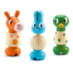 Ξύλινο παιχνίδι με βιδώματα της εταιρίας Djeco, όπου τα παιδιά βιδώνουν μεταξύ τους τα σωστά κομμάτια για να συνθέσουν ένα άλογο, ένα κουνέλι και μια πάπια! Μια εκπαιδευτική δραστηριότητα που αναπτύσσει τον συντονισμό χεριού-ματιού και τη λεπτή κινητικότητα, συμβάλλει στην ανάπτυξη της παρατηρητικότητας των παιδιών και βοηθά στην κατανόηση και αναγνώριση διαφορετικών σχημάτων, χρωμάτων και μεγεθών. Το παιχνίδι αποτελείται από 9 διαφορετικά ξύλινα μέρη, απολύτως ασφαλή για παιδιά. Κατάλληλο από 18 μηνών.