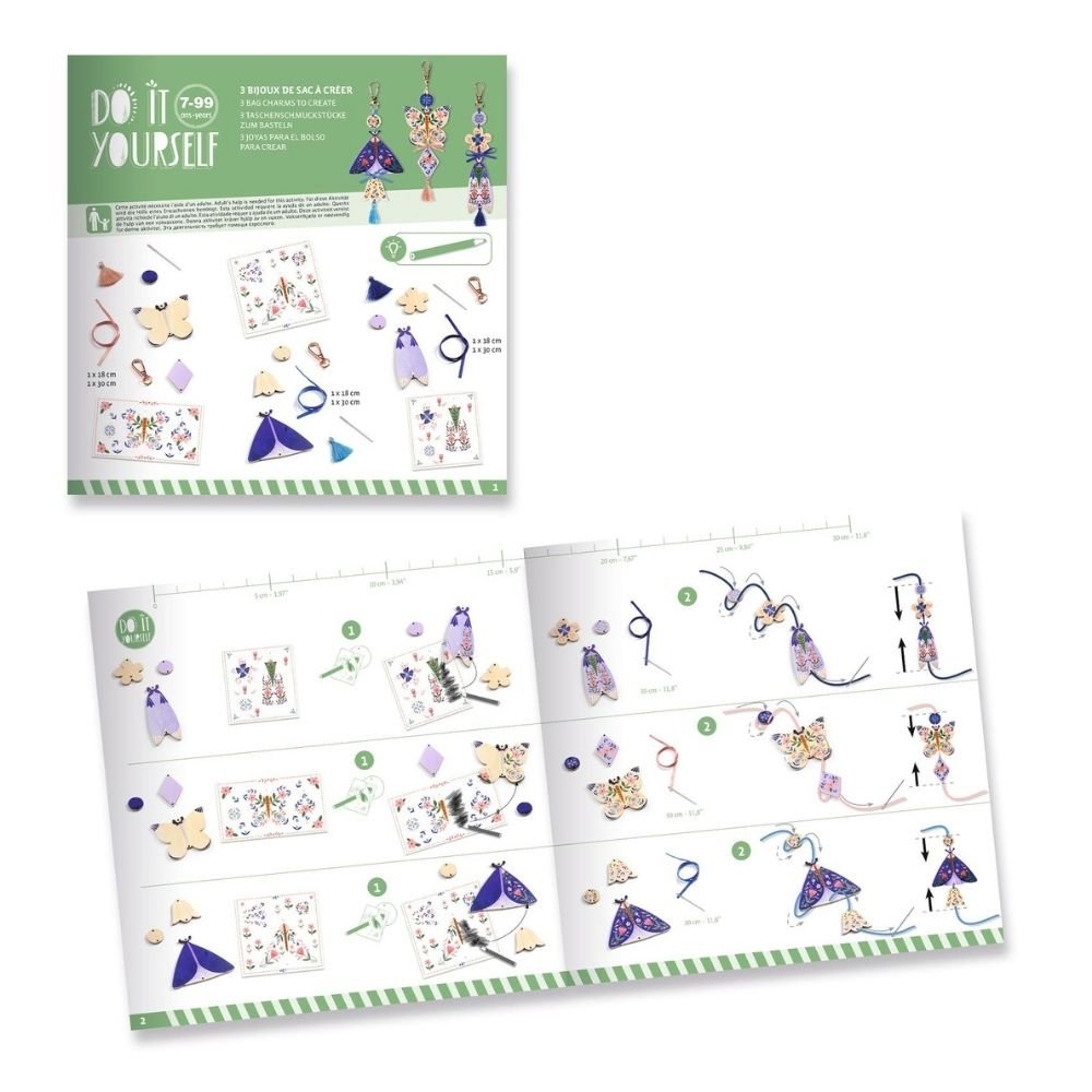 Ένα πρωτότυπο δημιουργικό σετ με 3 όμορφα μπρελόκ για να διακοσμήσουν τα παιδιά με πάνω από 100 αυτοκόλλητα και αξεσουάρ. Αφού ολοκληρωθούν, μετατρέπονται σε υπέροχα διακοσμητικά για τσάντες, μπρελόκ ή κλειδιά – μια μοναδική πινελιά προσωπικού στυλ! Η δραστηριότητα προσφέρει μια καινοτόμα τεχνική διακόσμησης ξύλου με decals, εύκολη και απολαυστική τόσο για ατομικό όσο και για ομαδικό παιχνίδι. Οι αναλυτικές οδηγίες βήμα προς βήμα καθοδηγούν το παιδί στη δημιουργία, ενισχύοντας τη φαντασία και τη λεπτή κινητικότητα. Φτιαγμένο από πιστοποιημένο FSC® χαρτί και χαρτόνι, με σεβασμό προς το περιβάλλον. Περιεχόμενα: 9 ξύλινα κομμάτια, 3 φύλλα με decals, 3 κλιπ-γαντζάκια, 3 φούντες, 3 βελόνες, 6 σατέν κορδέλες και 1 εικονογραφημένο φυλλάδιο οδηγιών.