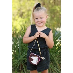 Παιδικό τσαντάκι από την εταιρεία Great Pretenders για εντυπωσιακές εμφανίσεις των μικρών δεσποινίδων που θα τραβήξει τα βλέμματα όλων. Το τσαντάκι – πορτοφόλι “μονόκερος” είναι φτιαγμένο από ροζ μεταλλικό ύφασμα, κομμάτια δερματίνης και είναι διακοσμημένο με έναν μονόκερο με 3D λεπτομέρειες. Περιλαμβάνει μία κεντρική θήκη που κλείνει με βέλκρο και χρυσό λουράκι για τον ώμο. Κατάλληλο για ηλικίες από 3 ετών. Διαστάσεις 12 x 13 εκ.