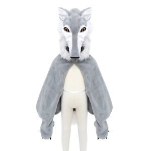 Λύκε, λύκε είσαι εδώ ? Μια γούνινη, απαλή και ζεστή κάπα που θα λατρέψουν οι μικροί μας φίλοι και θα χαρίσει ατελείωτες ώρες παιχνιδιού και φαντασίας! Το ρεαλιστικό κεφάλι του λύκου συμπληρώνεται από λευκή γούνα γύρω από τον λαιμό και την ουρίτσα καθώς και ενσωματωμένες πατούσες που χάρη στα μικρά λαστιχάκια επιτρέπει ακόμα και στα πιο μικρά χεράκια να τις φορέσουν. Πρότυπο μέγεθος παιδιού για την ηλικία 4 έως 6 ετών. Ύψος:104-116 εκατοστά. Μέση :64-66 εκατοστά. Γοφοί :56-57 εκατοστά.