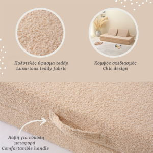 Ανακαλύψτε τον παιδικό καναπέ της εταιρείας Hakuna Matte, που υπόσχεται να μεταμορφώσει το δωμάτιο του παιδιού σας σε έναν κόσμο φαντασίας και διασκέδασης! Με διαστάσεις 150 x 66 x 52,5 εκ. και εξοπλισμένος με 2 αναδιπλούμενα στρώματα και 2 τρίγωνα μαξιλάρια, αυτός ο καναπές προσφέρει ατελείωτες δυνατότητες για παιχνίδι. Από κάστρο και διαδρομή εμποδίων μέχρι διαστημόπλοιο ή μια γωνιά για το διάβασμα, ο καναπές υπόσχεται να μεταμορφώσει κάθε στιγμή παιχνιδιού και χαλάρωσης του παιδιού σας και να ενισχύσει τη δημιουργικότητά του καθώς επίσης και το παιχνίδι ανοιχτού τύπου. Το πολυτελές ύφασμα τύπου “teddy” θα χαρίσει μια μοναδική αίσθηση ζεστασιάς και απαλότητας. Ανθεκτικό και στιλάτο, αυτό το υλικό δημιουργεί μια όμορφη ατμόσφαιρα σε κάθε δωμάτιο. Με αποσπώμενα και πλενόμενα καλύμματα στους 30°C και αδιάβροχο προστατευτικό στρώμα, ο καναπές είναι εύκολος στη φροντίδα. Απόλυτα ασφαλής για τα παιδιά, χωρίς αιχμηρές γωνίες, κάνει τους γονείς να μένουν ήσυχοι κατά τη διάρκεια του παιχνιδιού. Κι όταν το παιχνίδι τελειώσει, ο καναπές μετατρέπεται σε έναν άνετο & αναπαυτικό χώρο για ύπνο ή σε κρεβάτι για επισκέπτες. Σε φιλική προς το περιβάλλον συσκευασία, που μειώνει τις εκπομπές CO2 και τα απόβλητα και επαναφέρει τη φυσική του μορφή σε 48-72 ώρες, από τη στιγμή που θα ανοιχτεί. Προδιαγραφές: Μέγεθος: 150 x 66 x 52,5 εκ. Βάρος: 9,6 κιλά
