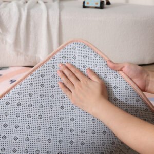 Χαλί υψηλής ποιότητας από την εταιρεία Hakuna Matte. Αποτελείται από 3 στρώσεις: 1. Βελούδο για την πιο απαλή επαφή με το δέρμα 2. Ελαστικό αφρού μνήμης (memory foam) για άνετο παιχνίδι και μπουσούλημα 3. Αντιολισθητικό υπόστρωμα για προστασία από κραδασμούς κατά την πτώση. Καθαρίζεται εύκολα με ηλεκτρική σκούπα ή πανί με νερό και σαπούνι, παρέχοντάς σας περισσότερο ποιοτικό χρόνο για να απολαύσετε τον χώρο σας και να παίξετε ανέμελα με τα παιδιά σας. Πλένεται στο χέρι στους 30°C. Ενδύκνειται για ενδοδαπέδια θέρμανση. Σημαντική διευκρίνηση: σε ξύλινο πάτωμα με ενδοδαπέδια θέρμανση συνίσταται κάθε 2-3 εβδομάδες να ανασηκώνετε στιγμιαία το χαλί, διότι οι κουκίδες από το αντιολισθητικό υπόστρωμα ενδέχεται να δημιουργήσουν κάποια αντίδραση με το φινίρισμα του ξύλου. Υλικό Κατασκευής: Premium Memory Foam πάχους 1.5 εκ., που επιστρέφει στο κανονικό πιο γρήγορα (μέσα σε 1-2 ημέρες) σε σύγκριση με οικονομικότερες εναλλακτικές λύσεις. 100% ΑΣΦΑΛΕΣ OEKO-TEX 100 STANDARD (αριθμός πιστοποιητικού: 10.HCN.80712) – το ασφαλές και άοσμο παιδικό χαλί είναι κατασκευασμένο χωρίς BPA, φθαλικό, φορμαμίδιο και PAH πολυεστέρα. Πληροί όλα τα πρότυπα ασφάλειας προϊόντων της Ε.Ε. Σχεδιάζεται στη Γερμανία και διαθέτει εγγύηση 2 ετών. Παραδίδεται διπλωμένο ως κουβέρτα σε σακούλα κενού αέρος. Η συμπιεσμένη συσκευασία του εξοικονομεί χώρο και βοηθάει έτσι στη μείωση στις εκπομπές CO2 κατά τη μεταφορά.