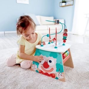 Ένας διασκεδαστικός κύβος δραστηριοτήτων με θέμα το τσίρκο. Γυρίστε τους περιστρεφόμενους δίσκους για να δείτε τις εναλλαγές φωτός και προβολής χρωμάτων. Προσπαθείστε να περάσετε τις χάντρες μέσα από τον λαβύρινθο με τον ιπτάμενο καλλιτέχνη!