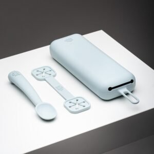 To σετ περιλαμβάνει ένα κουταλάκι σιλικόνης και μία πρωτότυπη κορδέλα σιλικόνης κατασκευασμένη με σκοπό να συγκρατεί τη σαλιάρα χωρίς να σφίγγει τον ευαίσθητο βρεφικό λαιμό και τα δύο τακτοποιημένα σε μια θήκη σιλικόνης.