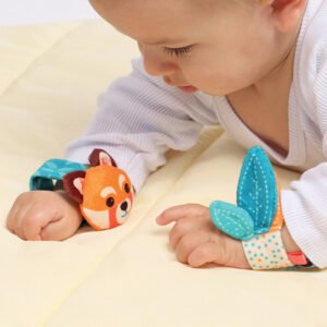 Κουνήστε χεράκια – ποδαράκια και εκπλαγείτε! Αυτό το σετ με τα βραχιολάκια και τα καλτσάκια της εταιρείας Ludi, θα ενθουσιάσει κάθε βρεφάκι καθώς τα όμορφα και έντονα χρώματά τους θα το προσκαλέσουν να εξερευνήσει και να ανακαλύψει τα μέλη του σώματός του. Τσαλακωμένα μέρη, κουδουνάκι, ετικέτες, κορδελίτσες και διαφορετικές υφές υπόσχονται ένα υπέροχο παιχνίδι για ένα χαρούμενο μωρό. Με αυτή την ενασχόληση αναπτύσσει τις αισθήσεις της αφής και της ακοής και στην προσπάθειά του να τα φτάσει και να τα πιάσει, ενεργοποιεί το συντονισμό ματιού – χεριού. Κατασκευασμένα από άριστης ποιότητας υλικά, πληρούν όλες τις προδιαγραφές ασφαλείας. Κατάλληλα από τη γέννηση. Διαστάσεις βραχιολιών: 2 x 16 εκ. Διαστάσεις καλτσών: 6 x 17 εκ.