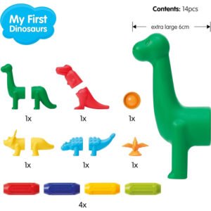 Σετ 14 μαγνητικών τεμαχίων. Κατασκευάστε τη δική σας παρέα δεινοσαύρων με ισχυρά, ασφαλή και μεγάλα μαγνητικά κομμάτια υψηλής ποιότητας. Το παιχνίδι αυτό ενισχύει τόσο την λεπτή όσο και την αδρή κινητικότητα, το συγχρονισμό χεριού-ματιού, την αναγνώριση χρωμάτων και σχημάτων, τη λογική σκέψη, τη φαντασία και τη δημιουργικότητα. Όλα τα σετ της Smartmax είναι συμβατά μεταξύ τους.