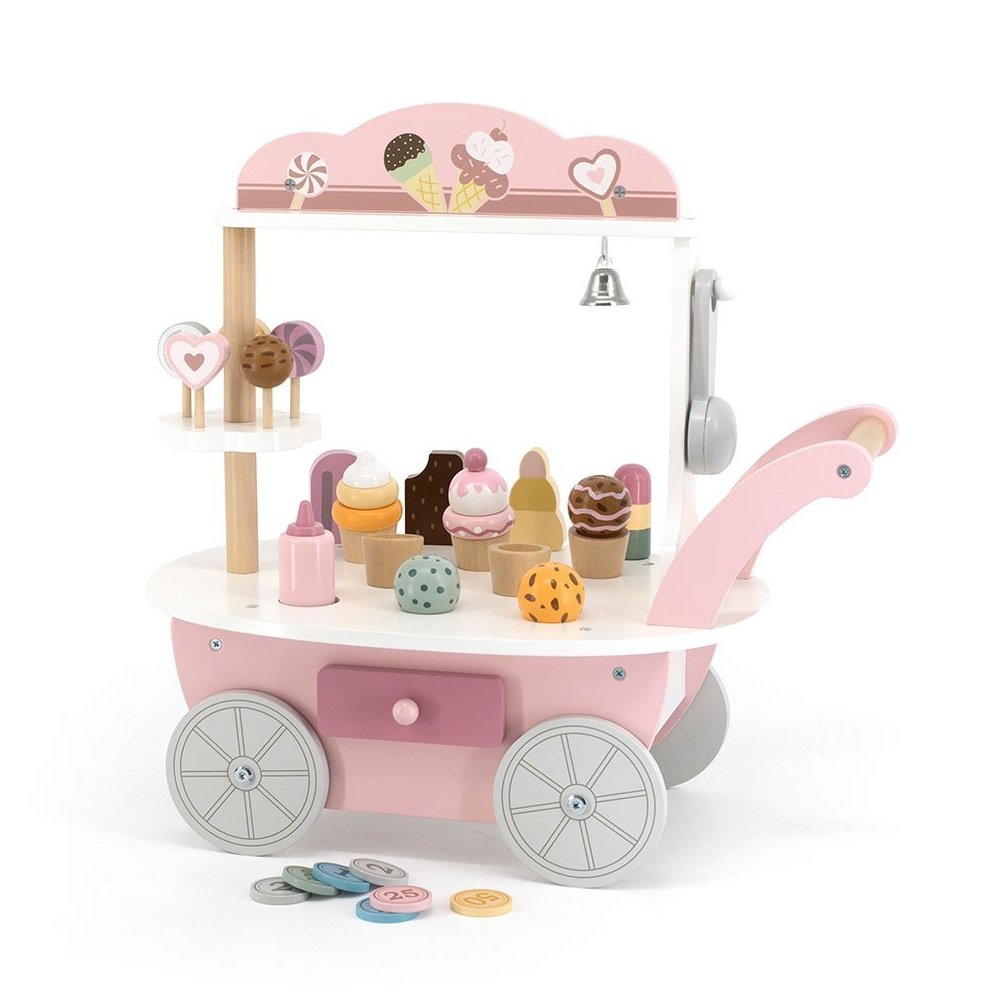Πόσο συναρπαστικός ένας πάγκος που το μικρό σας θα φτιάχνει και θα πουλάει παγωτά! Υπέροχο καροτσάκι παγωτού σε παστέλ αποχρώσεις με δίσκους και παγωτάκια από τη σειρά PolarB της εταιρίας Viga. Ένα μοναδικό παιχνίδι ρόλων που ενθαρρύνει τη φαντασία, την κοινωνική και την γλωσσική ανάπτυξη. Κατασκευασμένο από ξύλο υψηλής ποιότητας και χρώματα μη τοξικά με βάση το νερό. Εκτός από παιχνίδι ρόλων, μπορεί να αποτελέσει ένα υπέροχο στοιχείο διακόσμησης για το παιδικό δωμάτιο. To παιχνίδι περιέχει ένα ξύλινο καροτσάκι παγωτού με ρόδες, χρωματιστά χωνάκια παγωτού, γλειφιτζούρια και σκεύη. Κατάλληλο για παιδιά άνω των 3 ετών. Διαστάσεις συσκευασίας: 44 x 44 x 26 εκ.