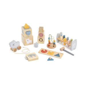 Υποστηρίξτε την ανάπτυξη του μικρού σας μέσα από το δημιουργικό παιχνίδι “Grow-with-me box” της εταιρείας Viga! Αυτό το σετ περιέχει έναν τέλεια μελετημένο συνδυασμό 6 παιχνιδιών, που υποστηρίζουν την ανάπτυξη του βρέφους στο σημαντικό ηλικιακό αναπτυξιακό ορόσημο των 12 έως 18 μηνών, που αποτελεί φανταστική διασκέδαση και ταυτόχρονα, μια ευκαιρία για την ανάπτυξη των γνωστικών και κινητικών δεξιοτήτων του. Τα εκπαιδευτικά παιχνίδια που περιέχονται στο σετ τραβούν την προσοχή κάθε μωρού, προκαλούν τη προσεκτική εξερεύνησή του, βελτιώνουν τις δεξιότητές του, διεγείρουν τις αισθήσεις και το μυαλό και συμβάλλουν στη σωστή γνωστική ανάπτυξη. Βασικά χαρακτηριστικά • Παιχνίδια κατασκευασμένα από ξύλο υψηλής ποιότητας • Δημιουργημένα με προσοχή στη λεπτομέρεια • Εξαιρετική ανθεκτικότητα • Λείες επιφάνειες, στρογγυλεμένες γωνίες • Απαλά χρώματα • Οικολογικός χαρακτήρας Το σετ περιλαμβάνει: 1. Καρφώματα 2. Κύβους ένθεσης & στοίβαξης 3. Λαβύρινθο με χάντρες 4. Ενσφηνώματα 5. Τρεχαλίτσα 6. Ξύλινο Βιβλιαράκι 7. Εκπαιδευτικό εγχειρίδιο